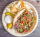 Grilled chicken breast, sliced gyro meat, roasted pepper & tomato, spiced onion & parsley mix, white basmati rice, cucumber and tomato salad, sliced lemon wedge, pepperoncini, all in a crispy pita bowl, served with hummus & tatziki for dipping.